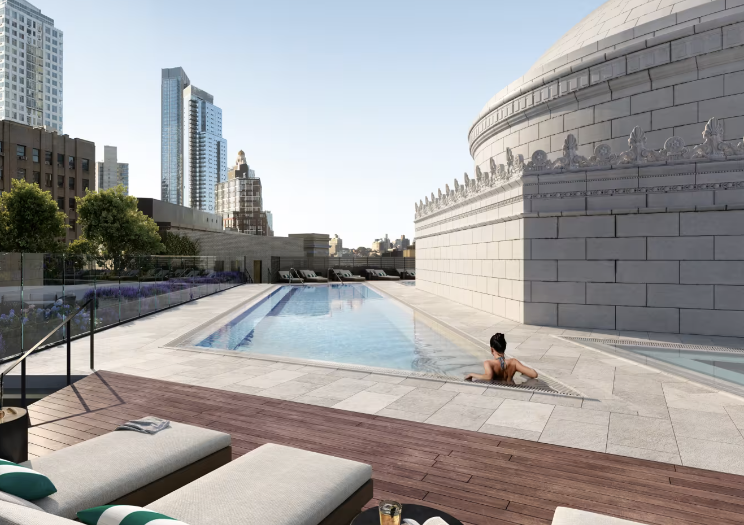 The amenities will be ready by the end of summer, she said. A Life Time club will occupy the entire sixth and seventh floors, and an outdoor pool deck wraps around the dome of the bank building.