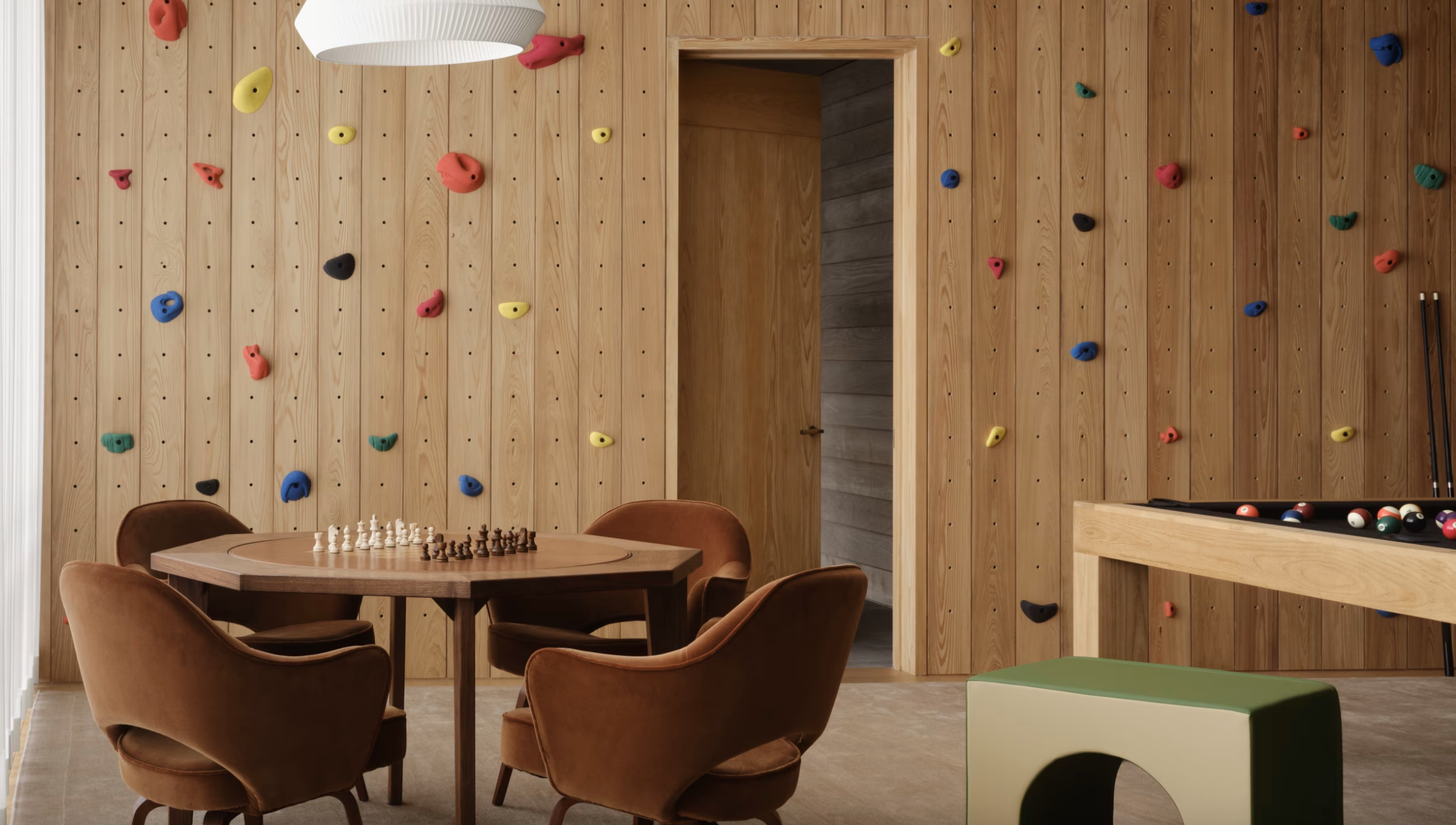 The game closet from the townhouse in “The Royal Tenenbaums”? That idea is back too, says Gachot. Last year she designed an epic game room backed by a rock climbing wall for a young family in Montana.