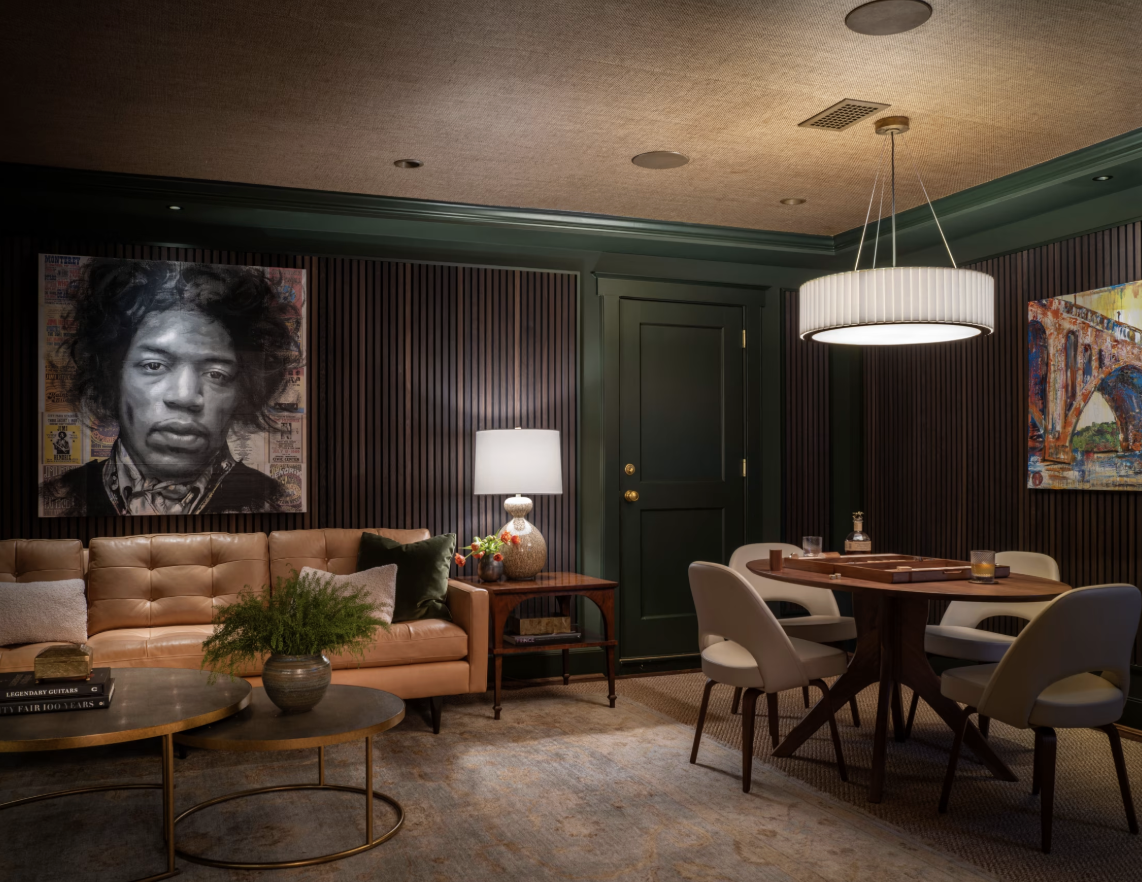 Freed from the need to accommodate an oversize television or stuff walls with miles of wiring, their design team—BarnesVanze Architects and designer Colman Riddell—could get more creative, dividing the space into discrete music and game zones.