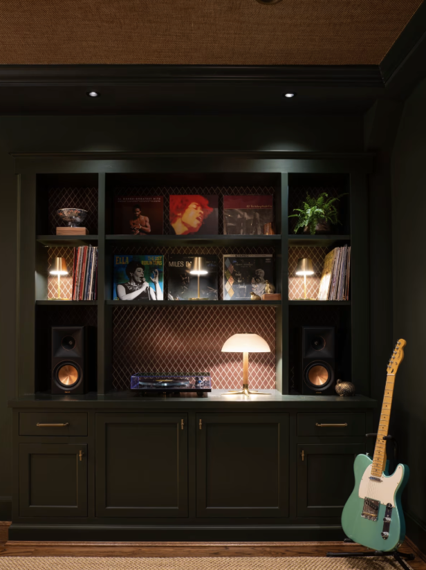A trio of collectible amps cluster behind a standing mic—forming a de facto stage where family and friends perform on karaoke nights. Built-in cabinets display a Rega turntable and the couple’s vinyl record collection.