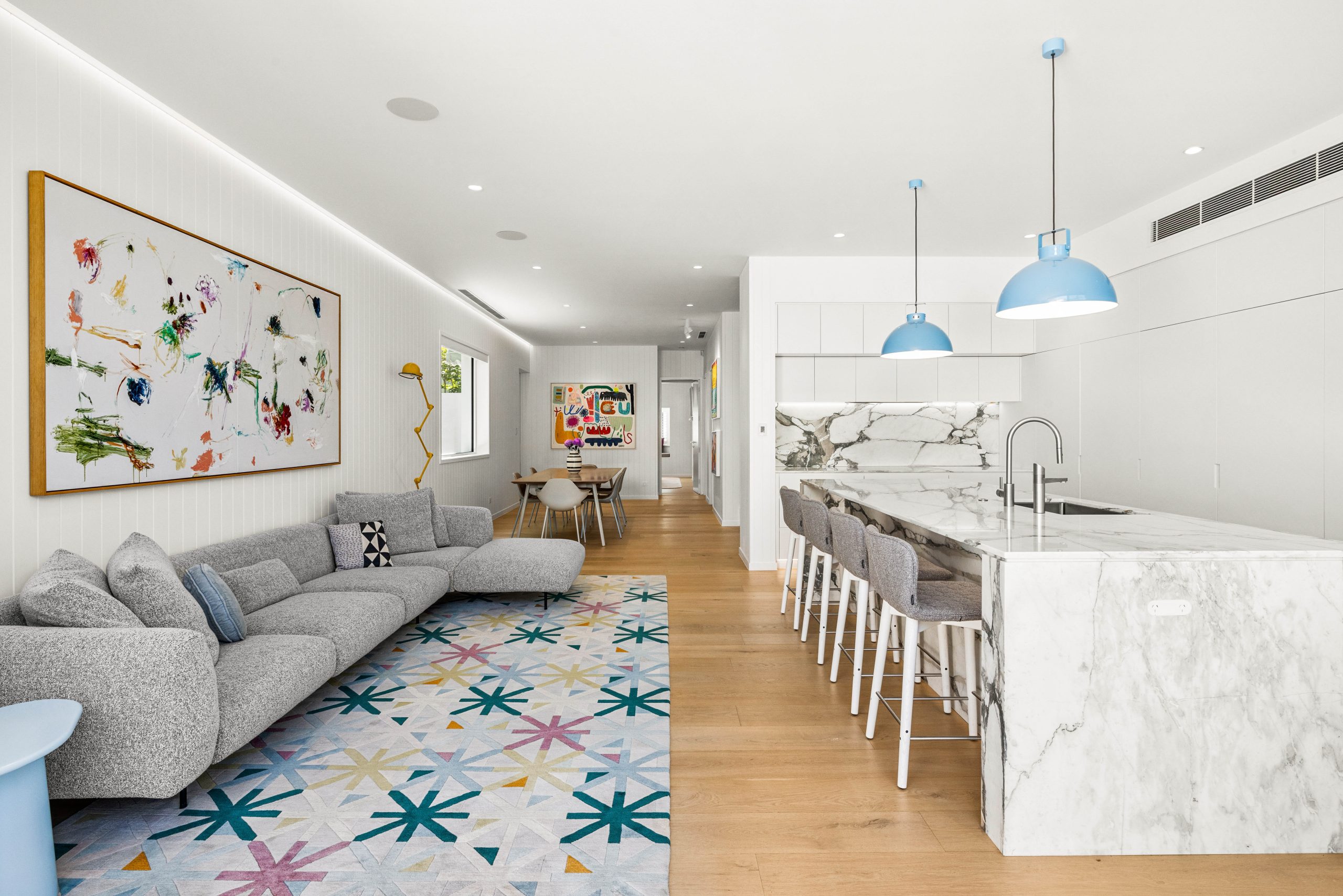 The sleek interiors of the two-storey Norris family home include European oak floors, Calacatta marble surfaces and extensive glazing to capture the coastal light.