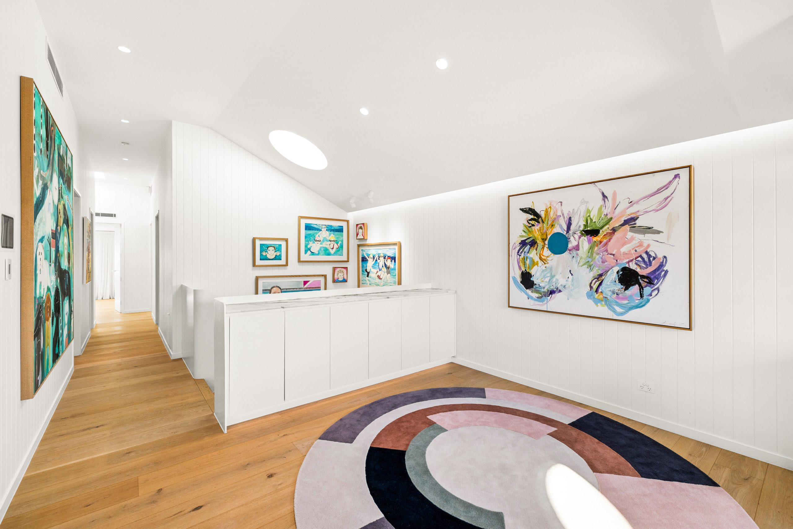 Upstairs, the views come into focus in the expansive second living room. There is a full communal bathroom and four more bedrooms, each with built-ins, one with an ensuite and two with integrated desks.