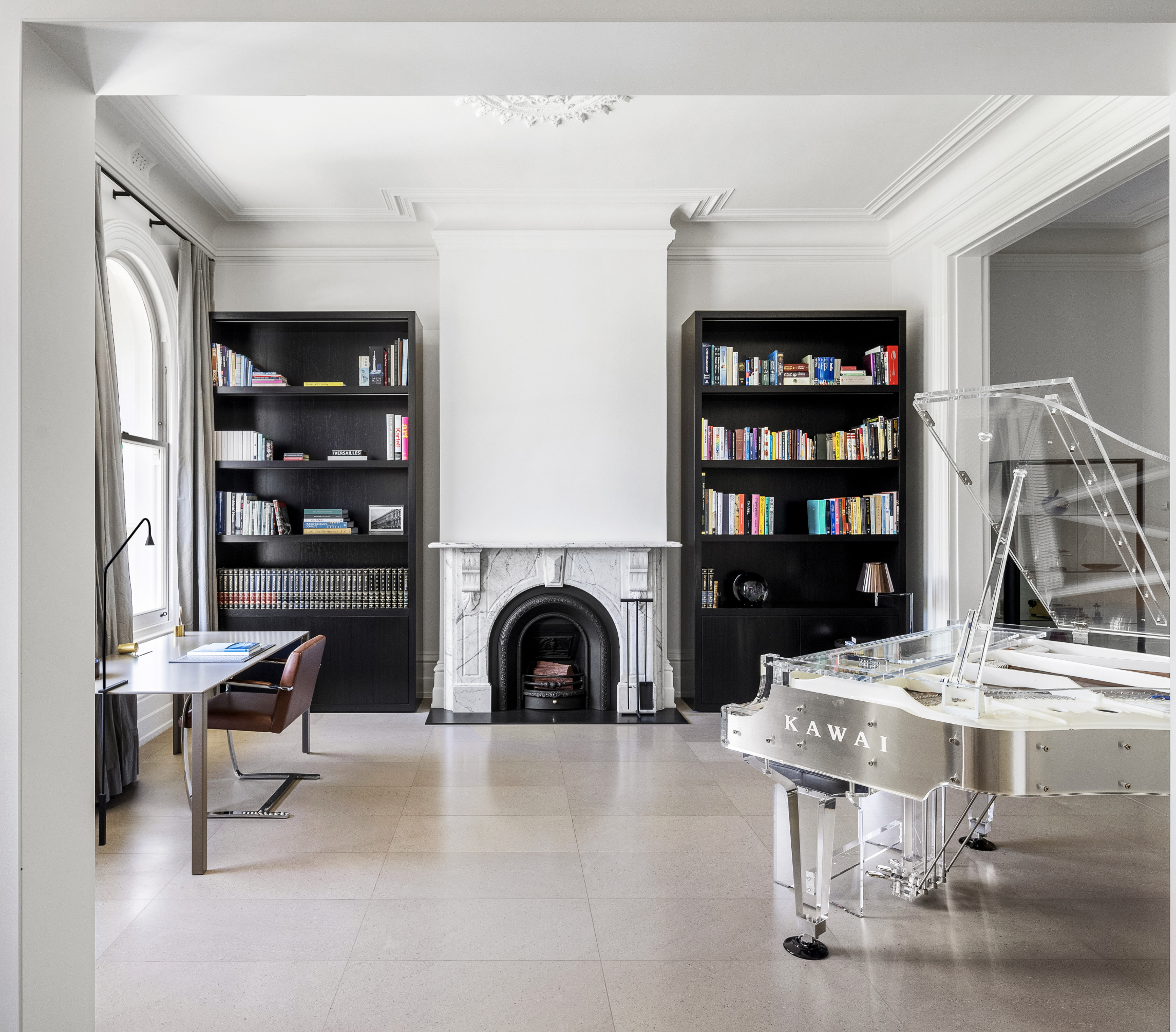 In the original front rooms, there are decorative cornices, ceiling roses and marble fireplaces. These classic old-world spaces with a modern makeover include a versatile music room, a library and a grand dining area.