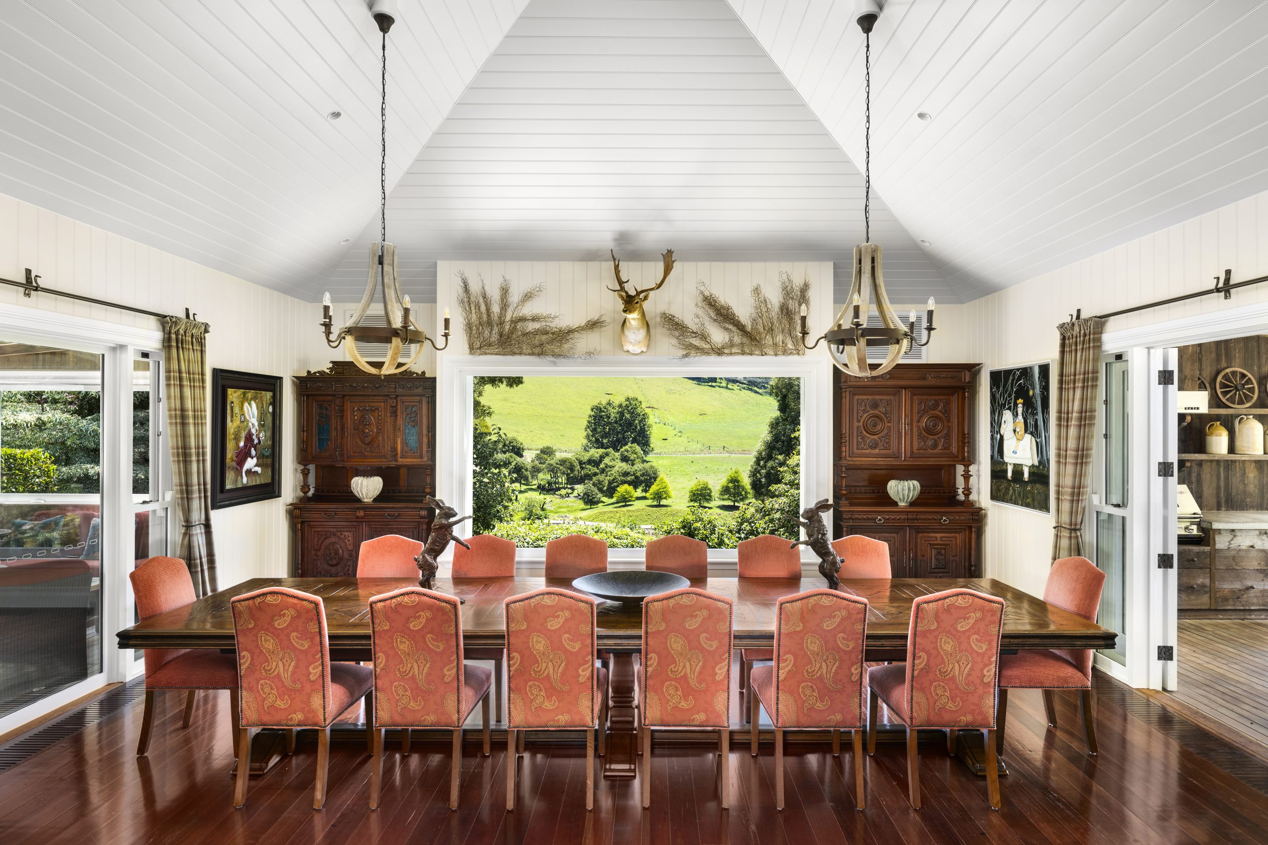 Beyond the meticulously sculptured gardens, complete with topiary hedges, terraced sandstone vegetable gardens and a traditional greenhouse, there are 4ha of landscaped parklands. The grounds feature a remnant rainforest, local artists’ sculptures, a 1.2ha spring-fed lake with its own island and wooden bridge, as well as an elaborate chicken hutch affectionately known as Cluckingham Palace.
