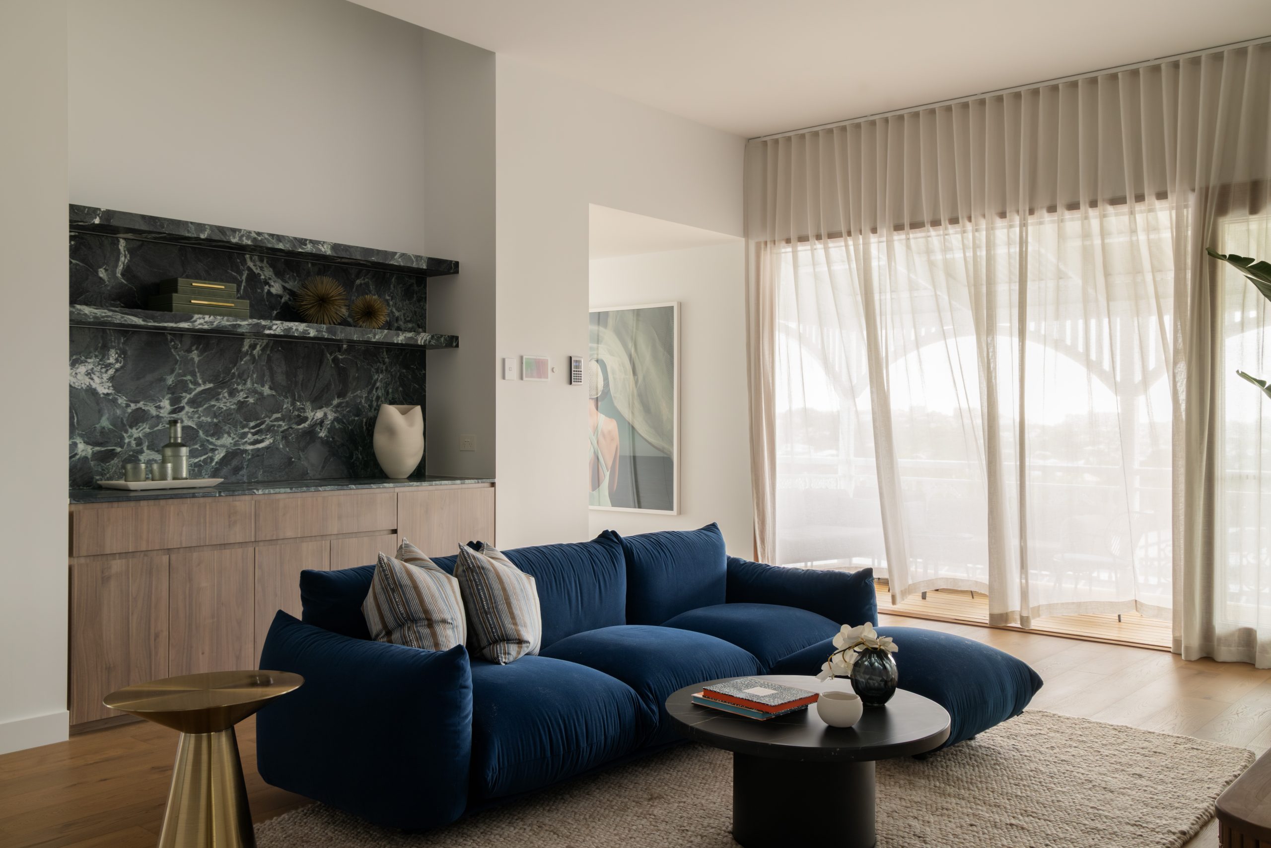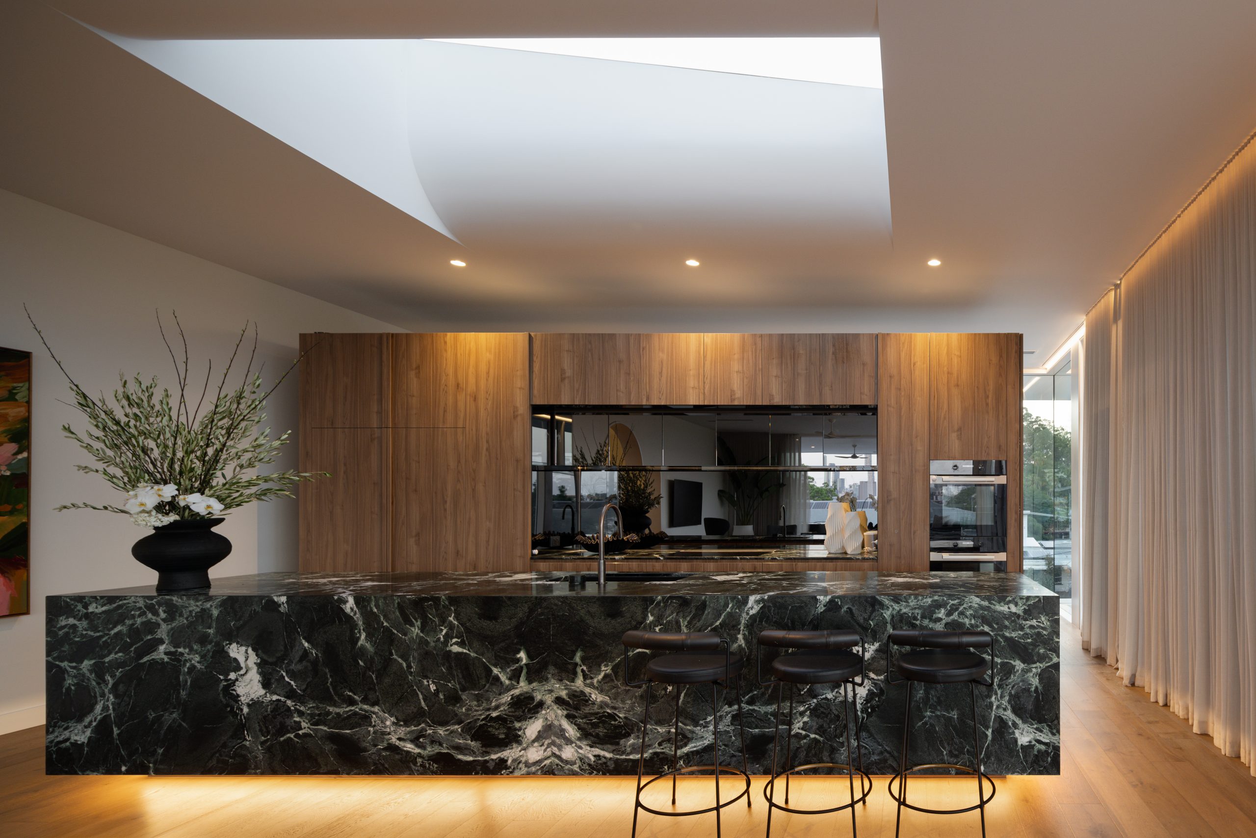 Inspired by nature, the interiors reflect the neighbourhood’s surrounding colour palette, with rich green marble accents and warm walnut-toned cabinetry. High 3.1m ceilings and floor-to-ceiling glass have also been used to frame the city and treetop views.