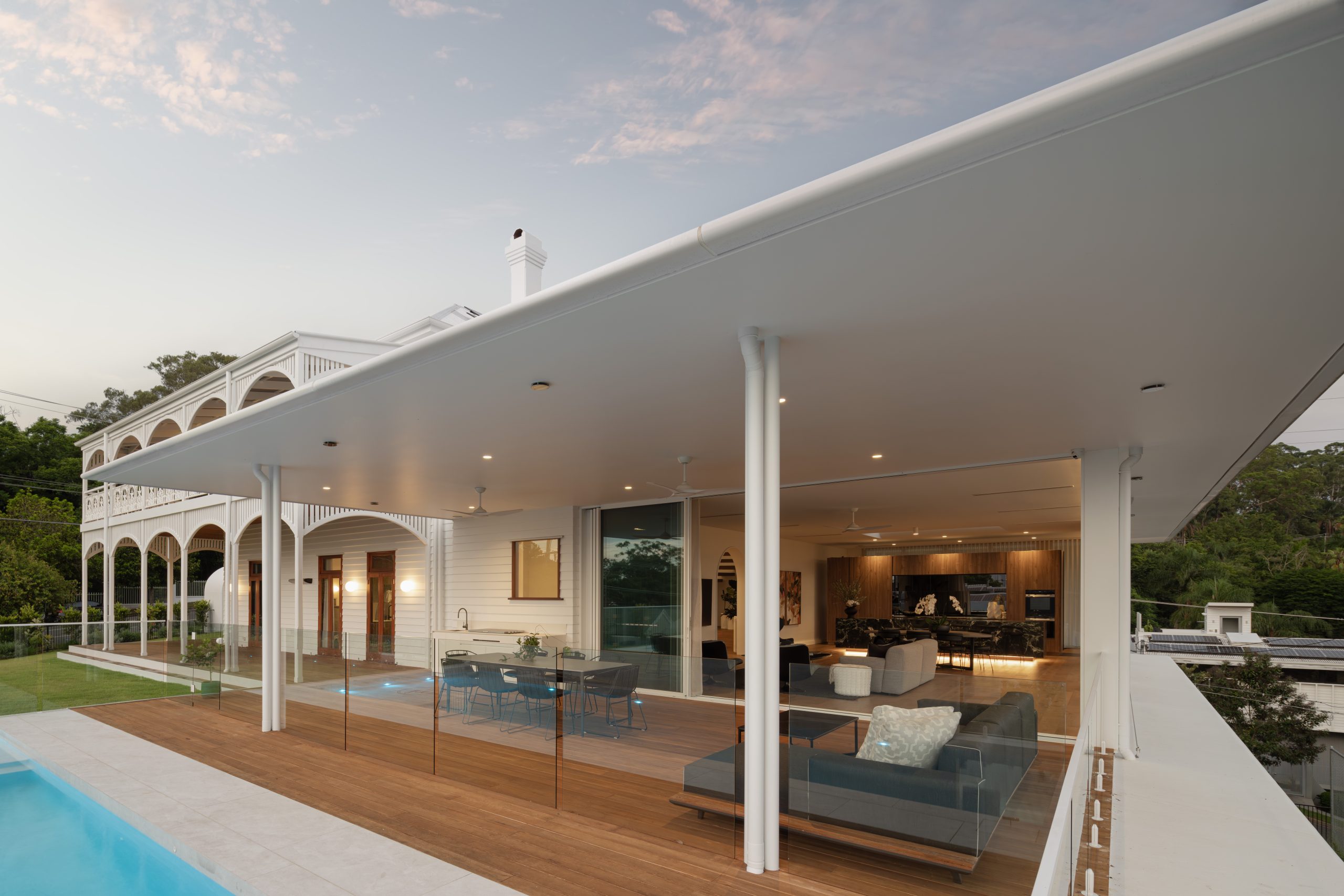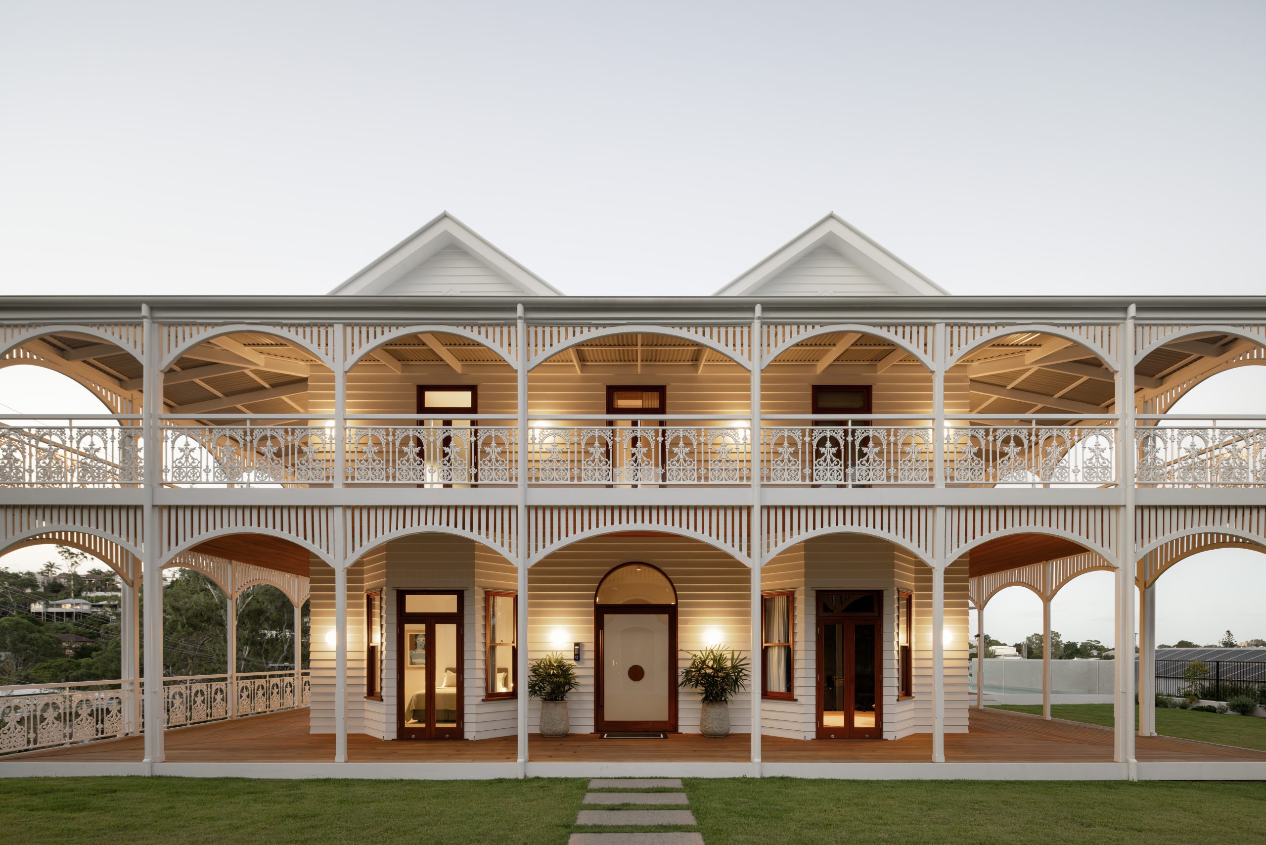 The gatehouse and veranda arches mirror the curves of the entrance hall, which, in turn, connects the original footprint to the contemporary addition and open plan family area.