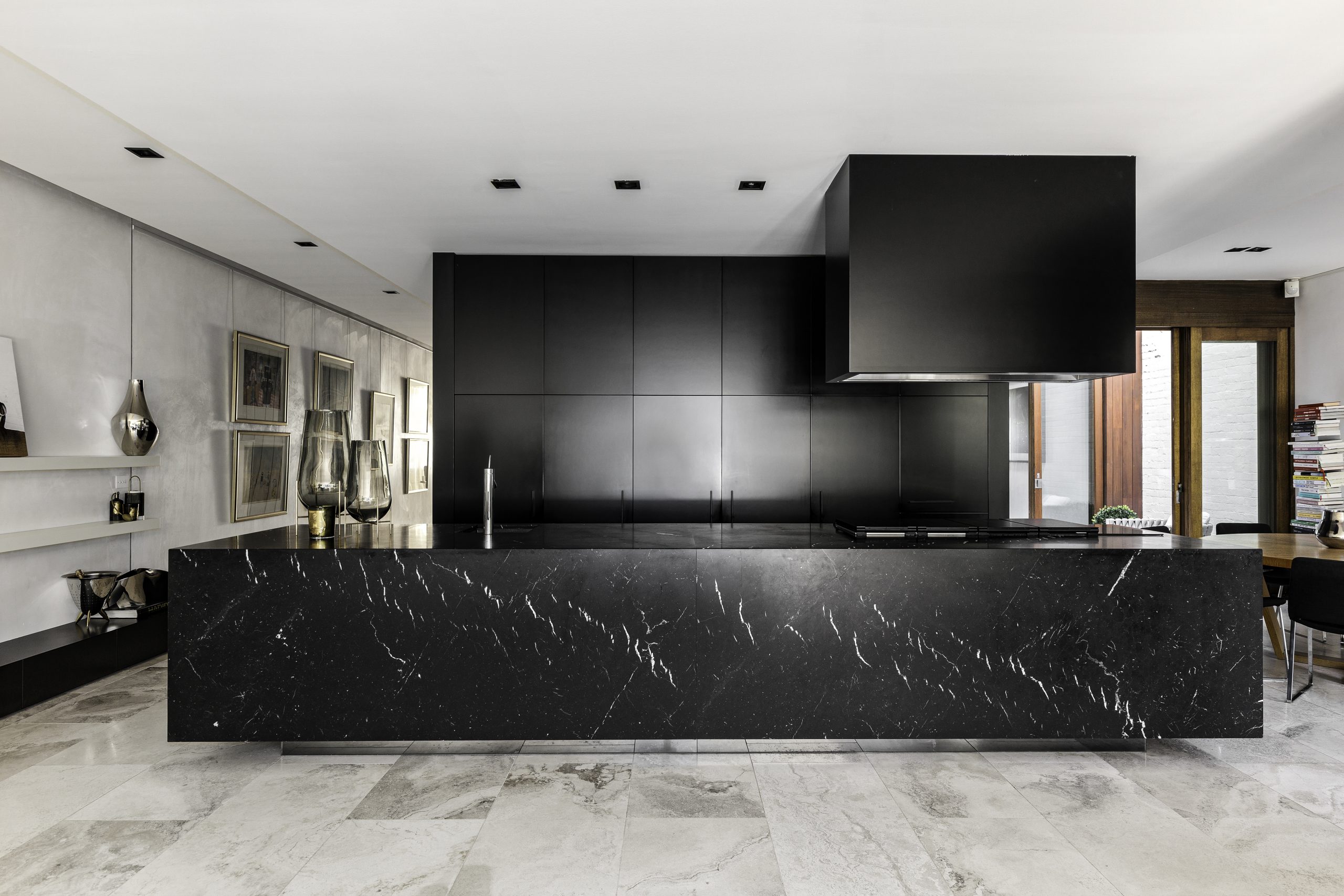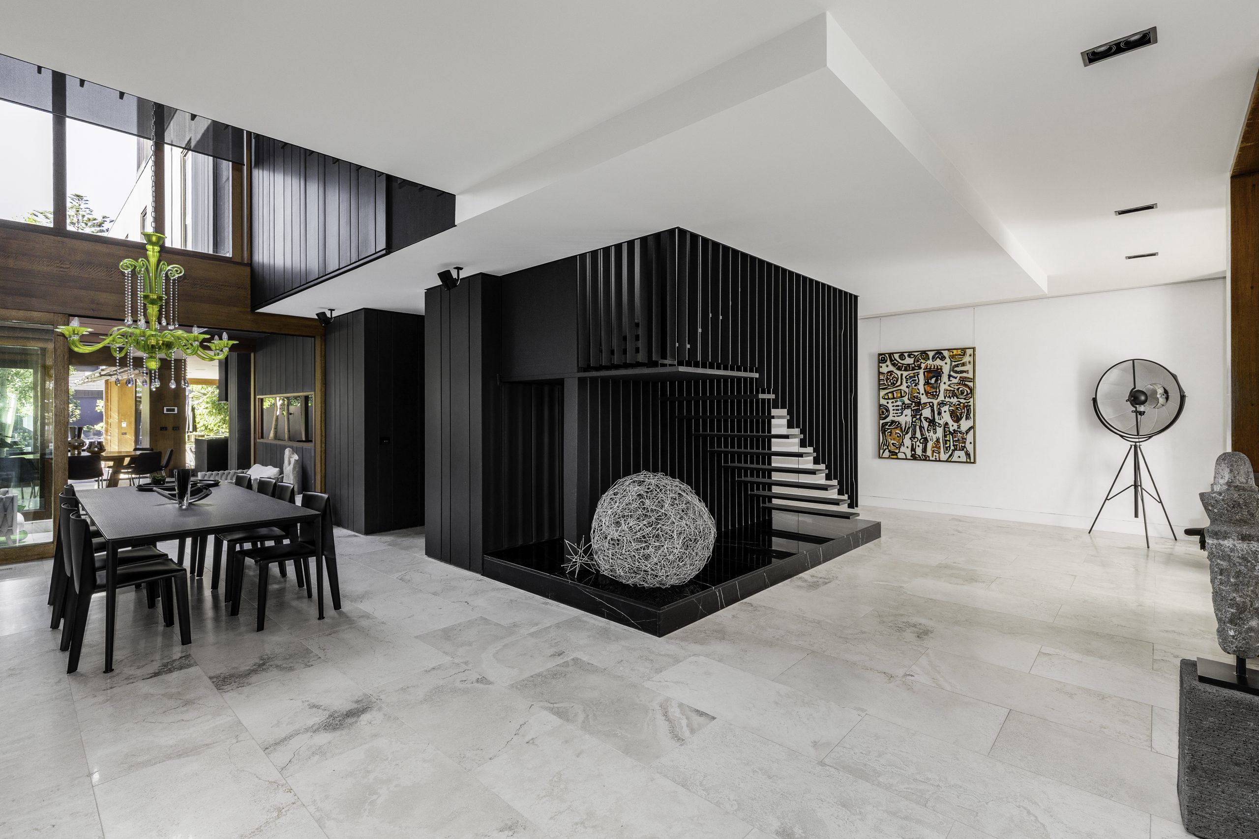 Beyond the iconic stairs, a gallery walkway leads through to the dining room and show-stopping kitchen. A design statement in itself, the sleek black kitchen has Gaggenau appliances, hidden storage, a grand island bench, a casual meals area, and a vast butler’s pantry with a second entry to cater for any sized soirée.