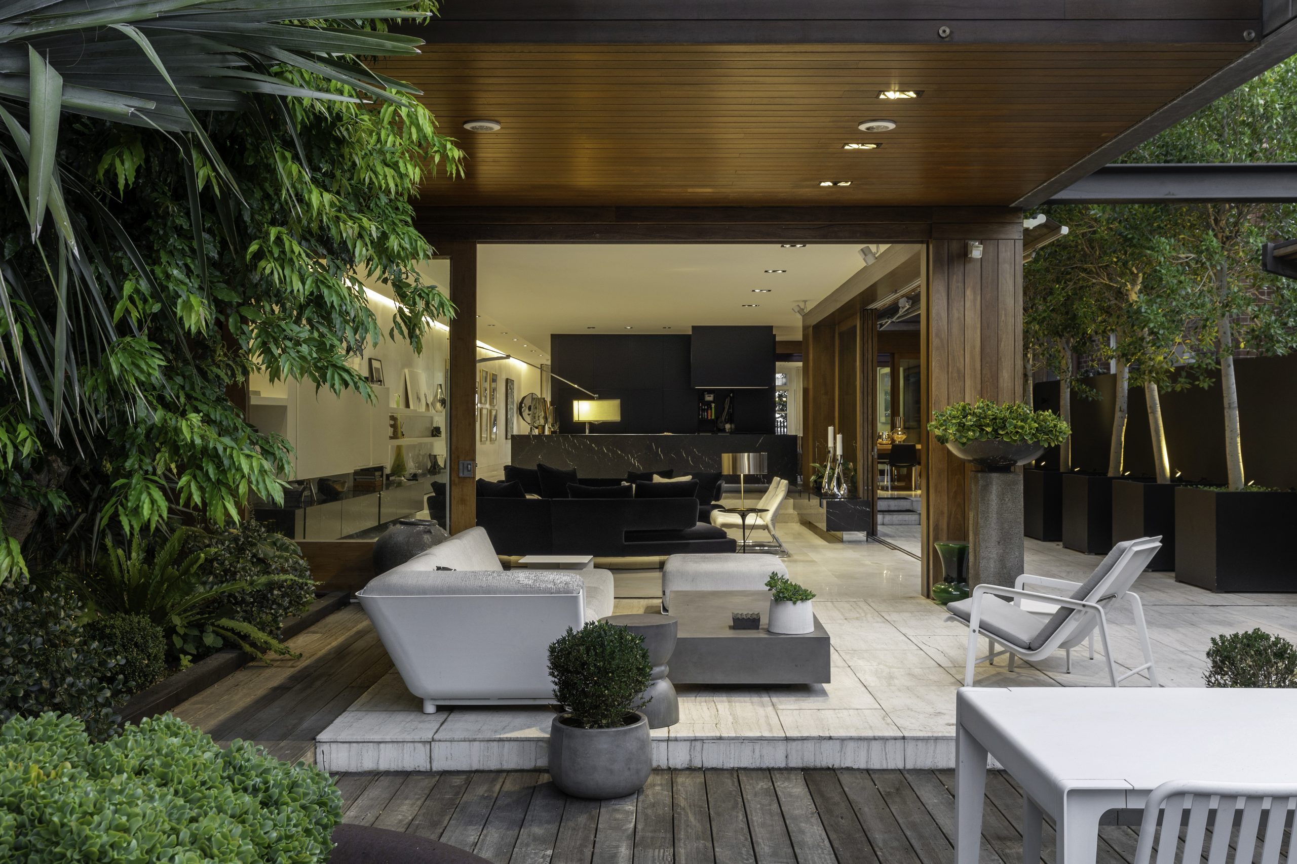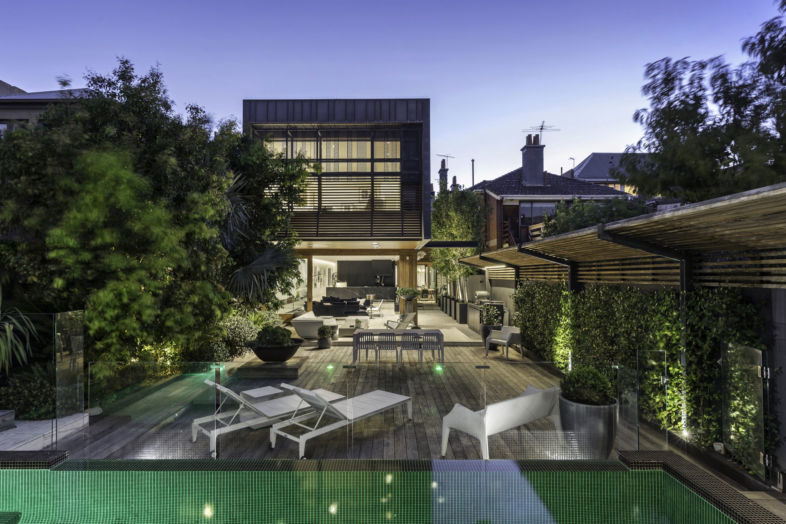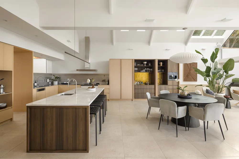 This ground level has marble floors, Venetian-plastered walls, and full-height glazing, as well as the mammoth rear extension. The stylish addition dishes up another large living room, warmed by an ethanol fireplace, and enormous timber-framed sliding doors that open onto the private north-facing pool deck and lush landscaped gardens.