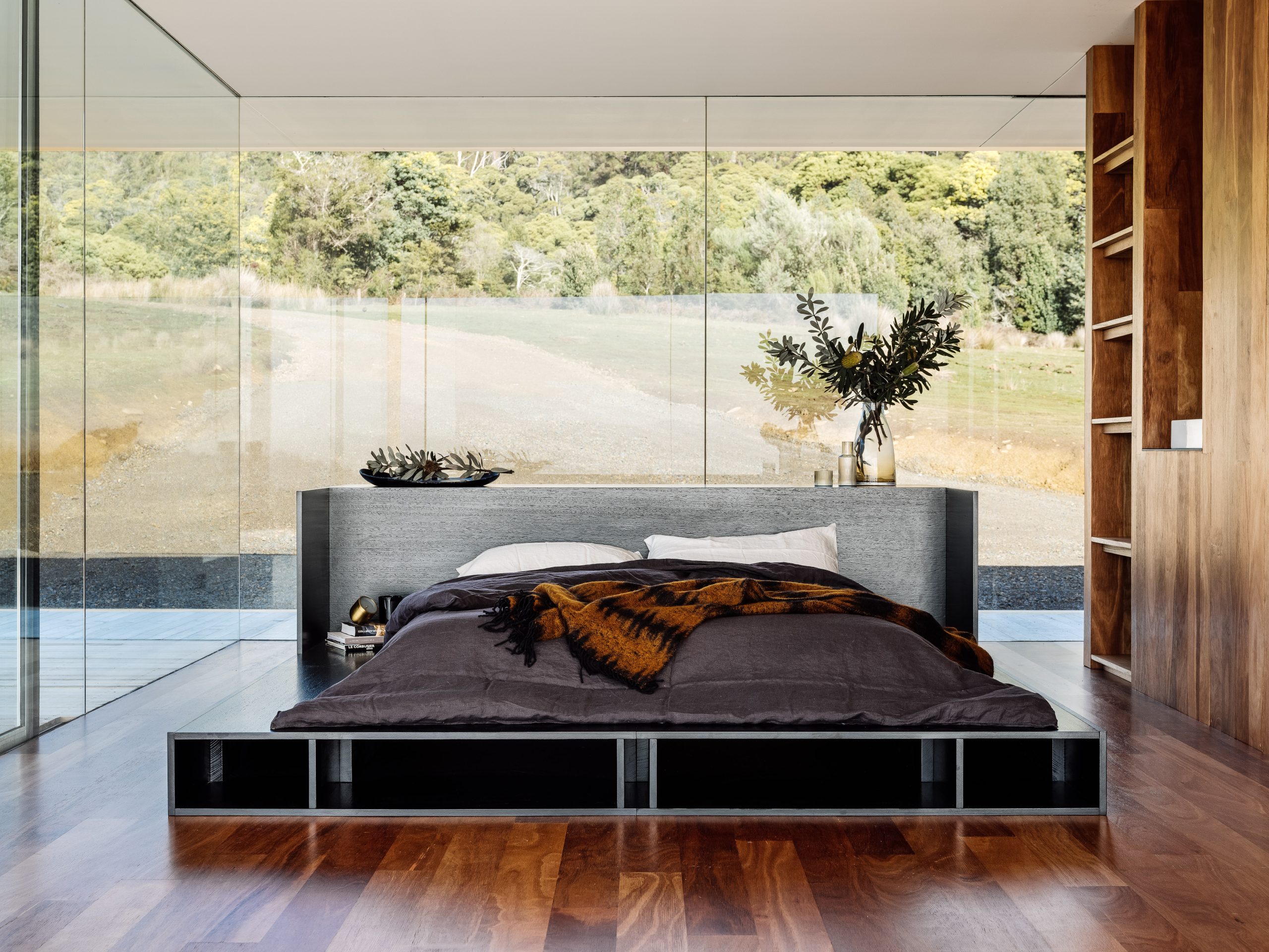 A second building, known as The Glass House, is a one-bedroom guest pavilion perched higher on the sloping block, offering an entirely different experience to the main house. It has 360-degree views and walls of glass with almost nowhere to hide.