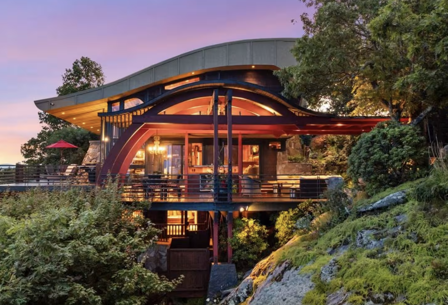 The 1970s home was designed by modernist architect Jim Fox, whose signature blend of simplicity and flair can be seen in the home’s flared roofs, glossy wooden interiors and suspended wraparound deck.