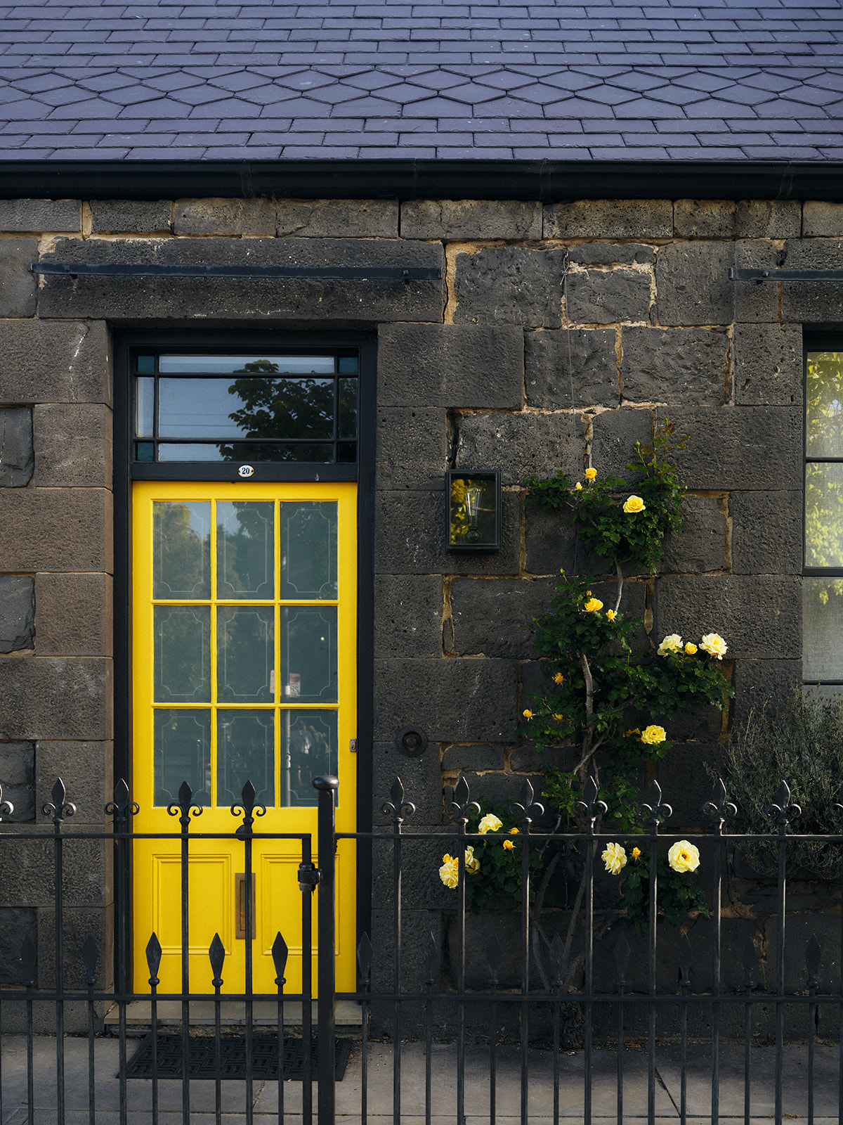 A bright yellow door stands out against Fitzroy House’s weathered bluestone façade, hinting at what lies beyond: a vivid, contemporary transformation balancing playfulness with elegance.