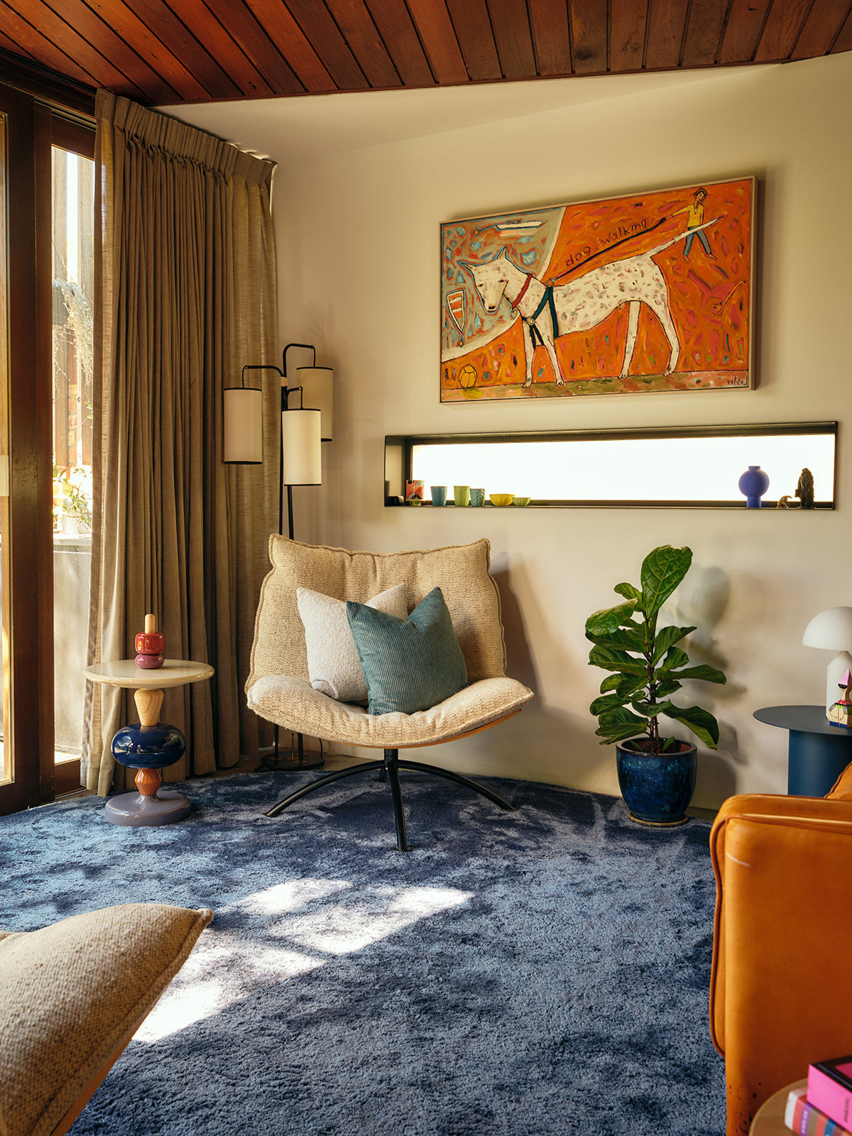 The home plays with unexpected materials and moments from hidden bursts of Yves Klein blue in bedroom joinery to a mirrored chrome panelled ceiling in the moody ‘Stone Room’.