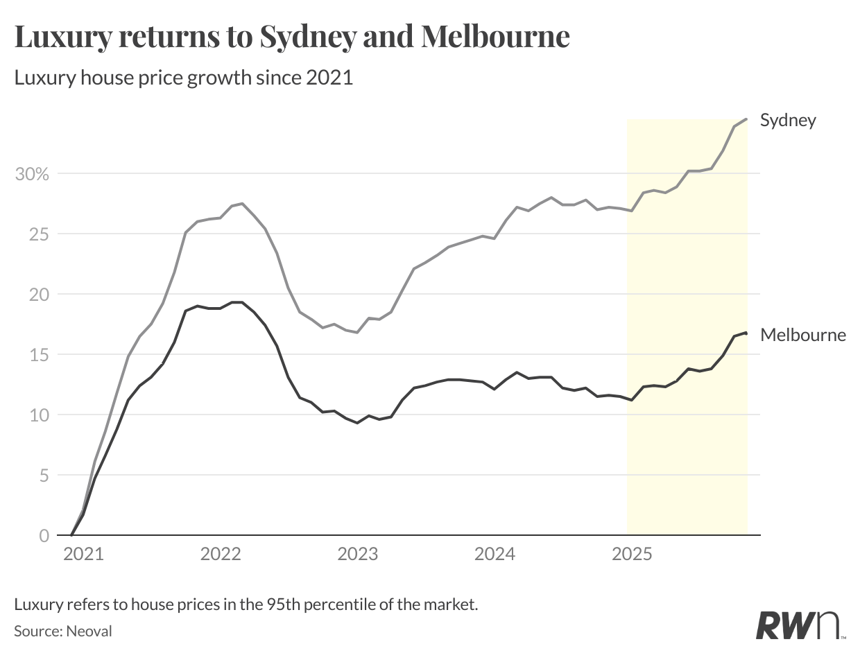 Melbourne, meanwhile, still hasn’t clawed back its pandemic peak. Luxury prices there rose five per cent between 2024 and 2025 after falling one per cent the year prior, ending 2025 at $2.6 million.